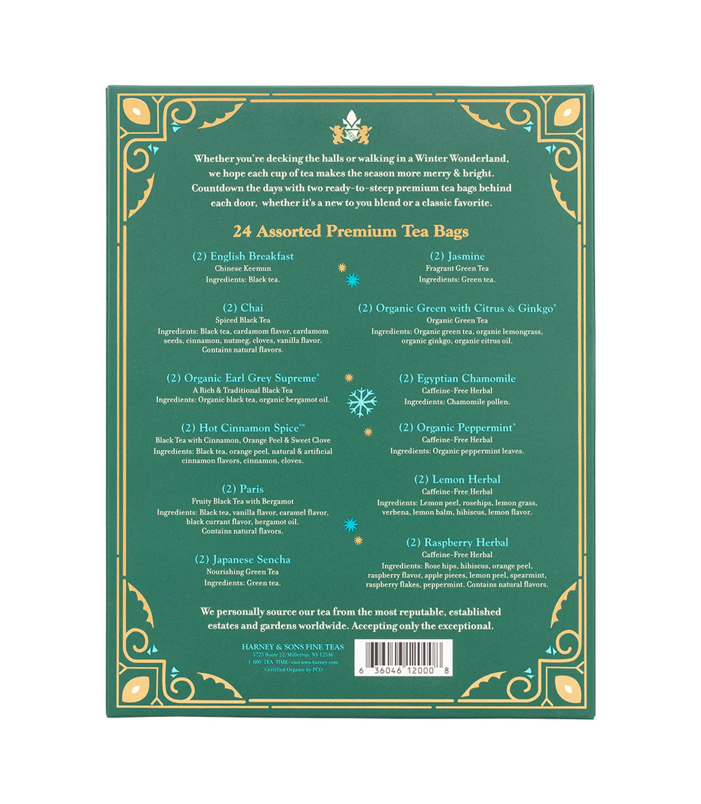 Whether you're decking the halls or walking in a Winter Wonderland, we hope each cup of tea makes the season more merry and bright. Count down the days with two ready-to-steep premium tea bags behind each door, whether it's a new to you blend or a classic favorite. From Harney & Sons.