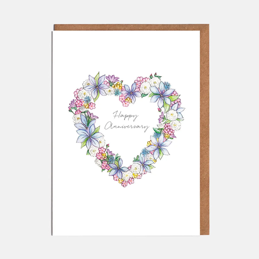 Make your special day memorable with this floral Anniversary Card. Crafted from sustainable card stock, this unique design features Lottie's hand drawn illustrations of a heart shaped floral bouquet. By Lottie Murphy.