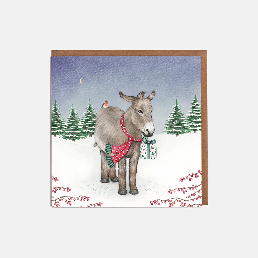 Lovely holiday card illustrated by Lottie Murphy, featuring a Christmas donkey and his robin friend.