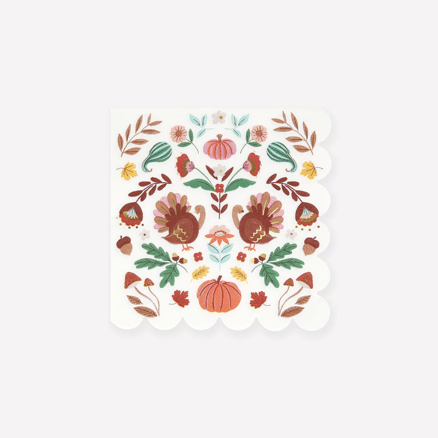 A folk theme is the ultimate way to embrace the charm of fall and Thanksgiving. Rich, earthy colors embody this season's warm tones, while harvest-inspired symbols celebrate nature's beauty. Meri Meri's clever designers have re-imagined these timeless elements for these stylish paper napkins, bringing a perfect blend of tradition and trend to your party table.