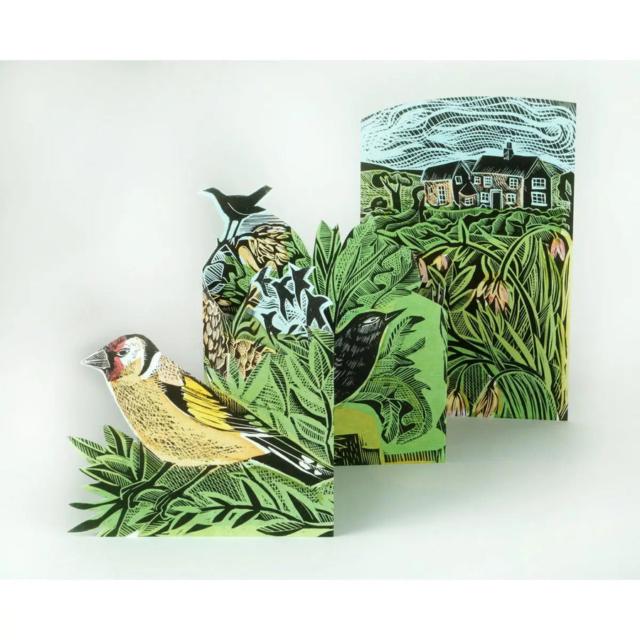 Garden Birds linocut concertina card by artist Angela Harding. Packed with a buff colored envelope.