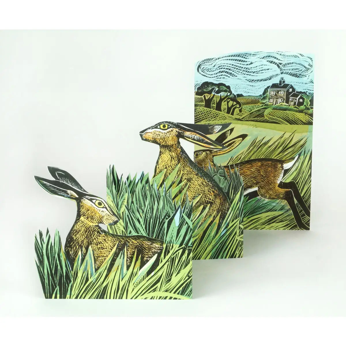 Hare & Open Fields linocut concertina card by artist Angela Harding. Packed with a buff colored envelope.