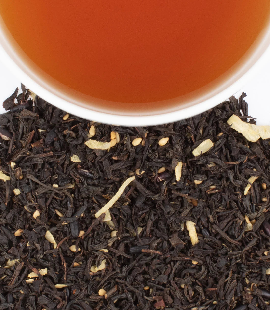 Black tea, toasted rice, coconut pieces, sesame seeds, coconut flavor, caramel flavor. Contains natural flavors.