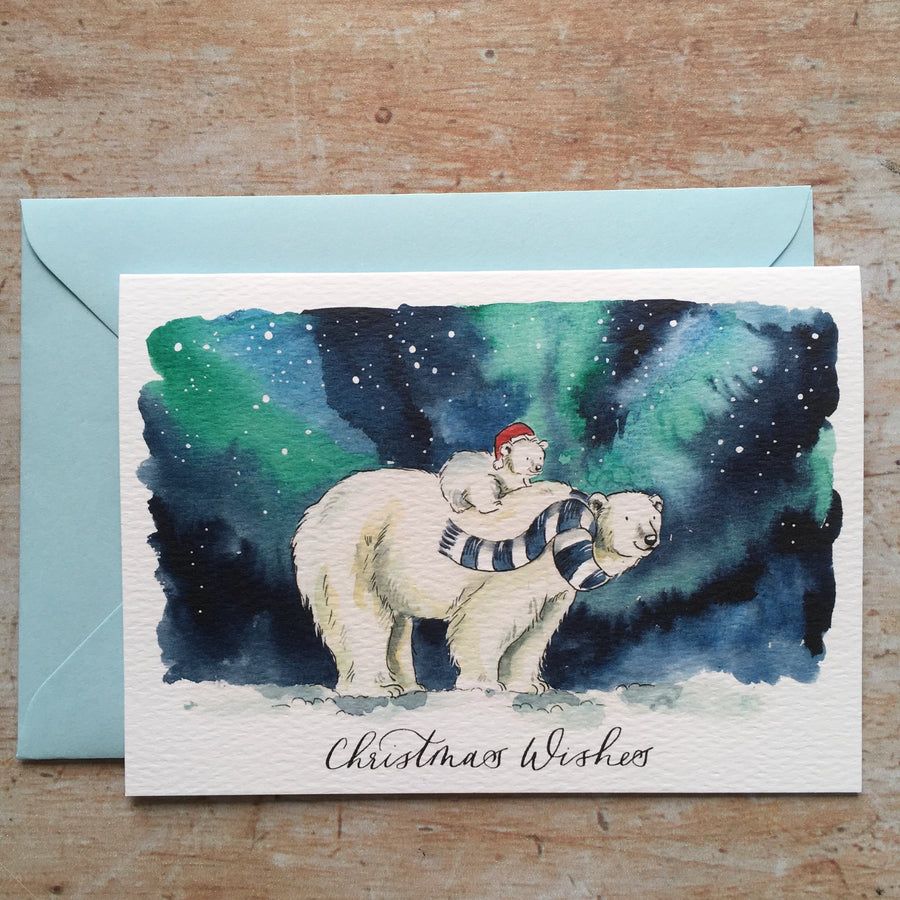 Send 'Christmas Wishes' with this beautiful card featuring a polar bear and cub against a starry, snowy night sky. The little cub is wearing a santa hat to get into the festive mood.