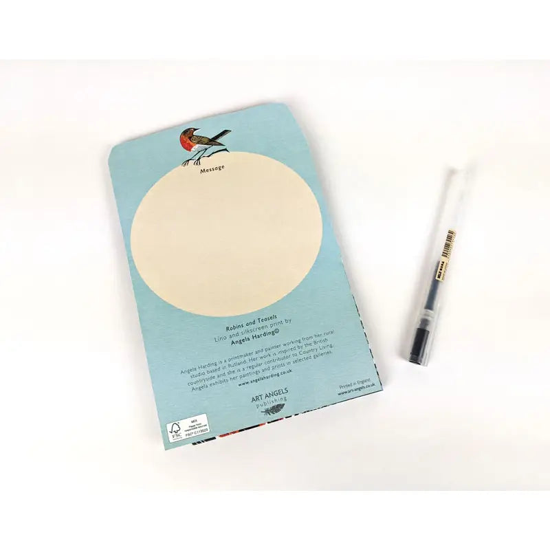 Robins and Teasels linocut concertina card by artist Angela Harding. Packed with a buff colored envelope.