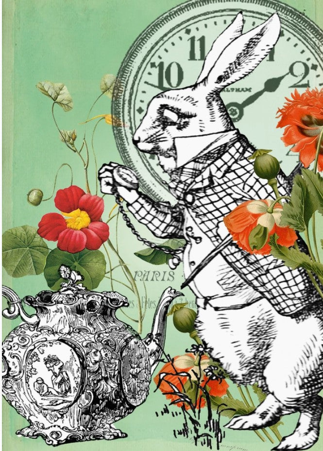 Whimsical blank card from Madame Treacle featuring the white rabbit from Alice in Wonderland checking his pocketwatch on a green background.