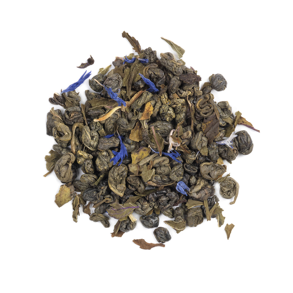 Green Tea, 10% Peppermint, Cornflower Petals, Flavouring.